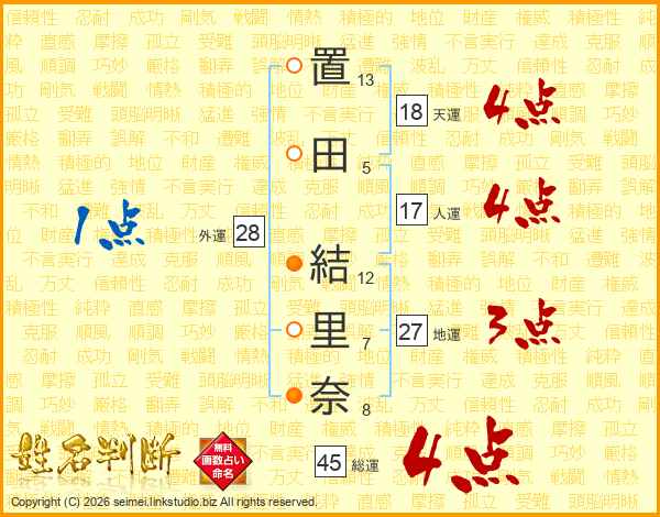 置(13画)田(5画) 結(12画)里(7画)奈(8画)