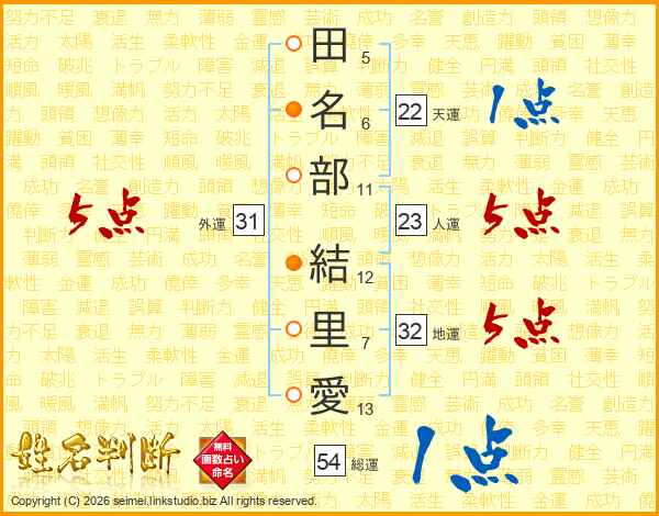 田(5画)名(6画)部(11画) 結(12画)里(7画)愛(13画)