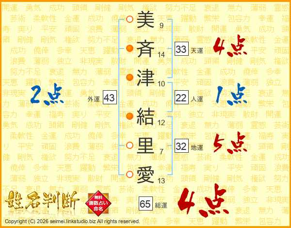 美(9画)斉(14画)津(10画) 結(12画)里(7画)愛(13画)