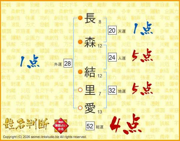 長森結里愛さんの総運は52画の4点!