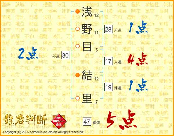 浅野目結里さんの総運は47画の5点!