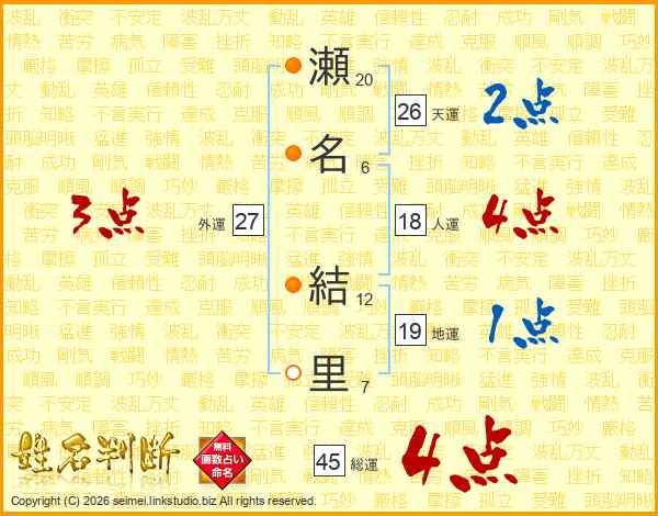 瀬(20画)名(6画) 結(12画)里(7画)
