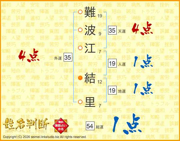 難(19画)波(9画)江(7画) 結(12画)里(7画)