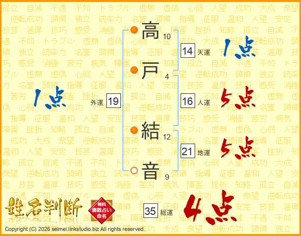 高戸結音さんの地運は21画の5点!