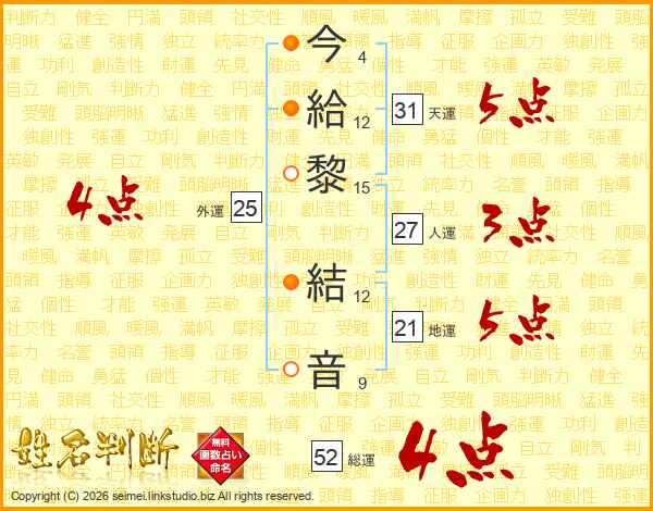 今(4画)給(12画)黎(15画) 結(12画)音(9画)