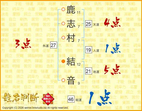 鹿(11画)志(7画)村(7画) 結(12画)音(9画)