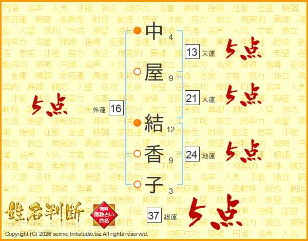 中屋結香子さんの天運は13画の5点!