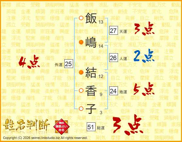 飯(13画)嶋(14画) 結(12画)香(9画)子(3画)