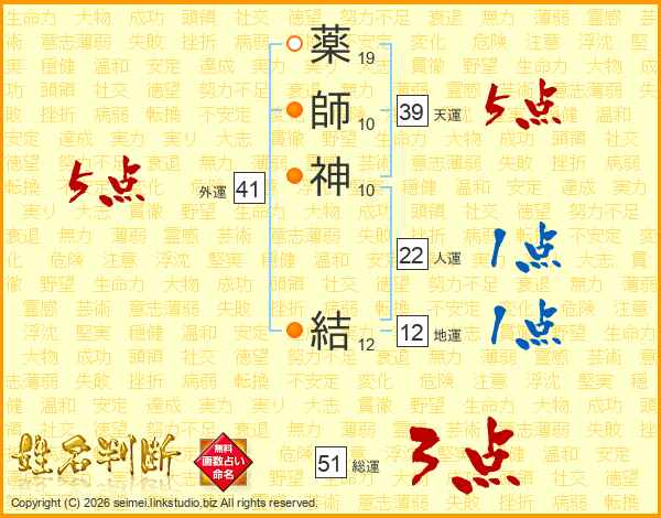 薬(19画)師(10画)神(10画) 結(12画)