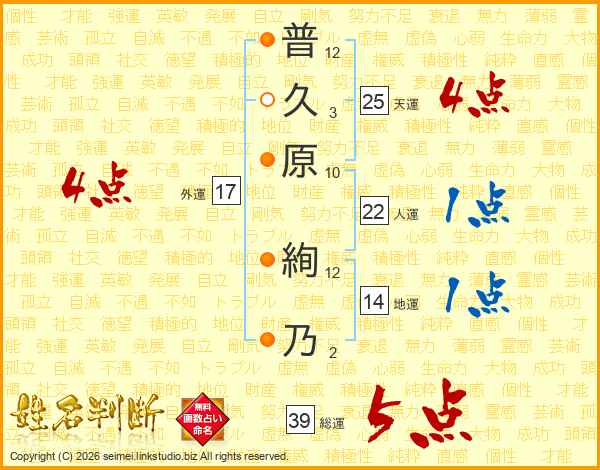 普(12画)久(3画)原(10画) 絢(12画)乃(2画)