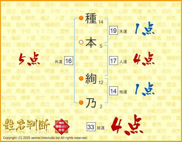 種(14画)本(5画) 絢(12画)乃(2画)