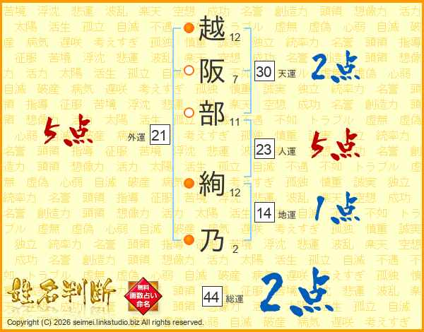 越(12画)阪(7画)部(11画) 絢(12画)乃(2画)