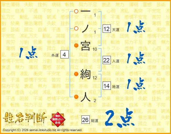 一(1画)ノ(1画)宮(10画) 絢(12画)人(2画)
