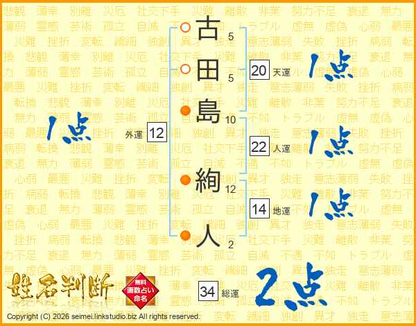 古(5画)田(5画)島(10画) 絢(12画)人(2画)