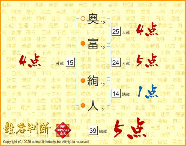 奥(13画)富(12画) 絢(12画)人(2画)