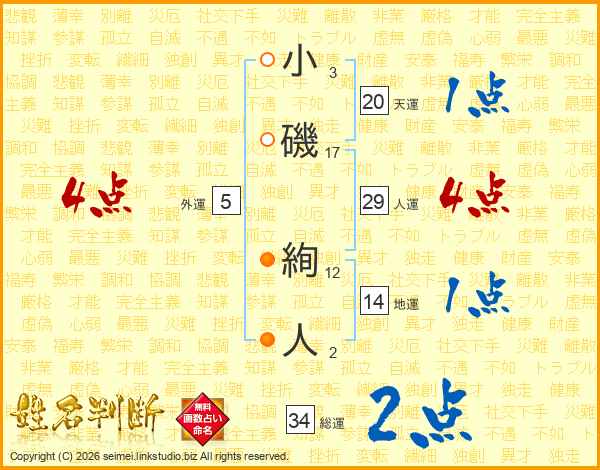 小磯絢人さんの総運は34画の2点!