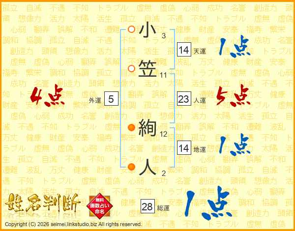 小(3画)笠(11画) 絢(12画)人(2画)