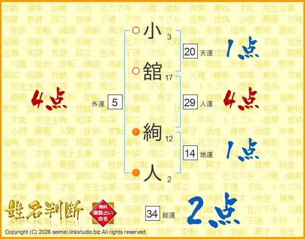 生活面を象徴する運勢です。外部から受ける影響力を表し、結婚運、家庭運や職場、環境への順応性を表します。総運から人運を引いた画数。姓や名が1文字の場合を除く。