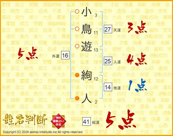 小(3画)鳥(11画)遊(13画) 絢(12画)人(2画)