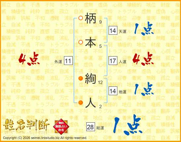 柄(9画)本(5画) 絢(12画)人(2画)