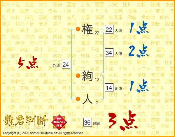 権(22画) 絢(12画)人(2画)
