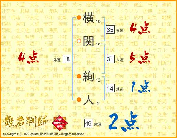 生活面を象徴する運勢です。外部から受ける影響力を表し、結婚運、家庭運や職場、環境への順応性を表します。総運から人運を引いた画数。姓や名が1文字の場合を除く。