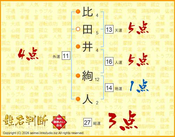 比(4画)田(5画)井(4画) 絢(12画)人(2画)
