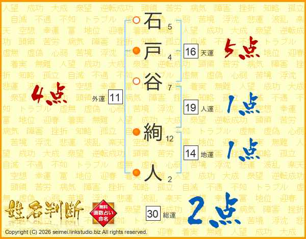 石(5画)戸(4画)谷(7画) 絢(12画)人(2画)