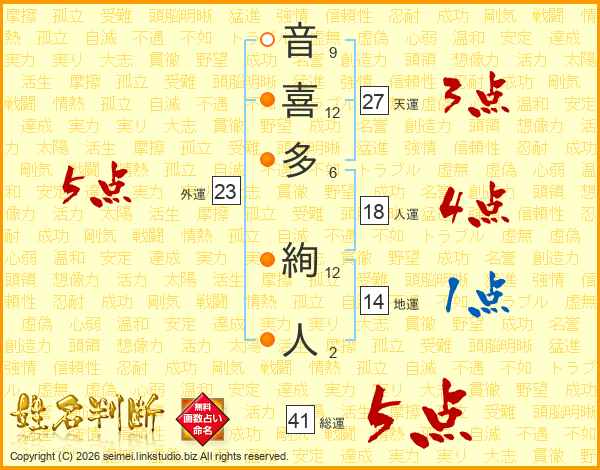 音(9画)喜(12画)多(6画) 絢(12画)人(2画)
