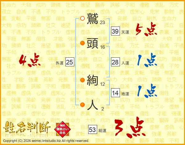 鷲(23画)頭(16画) 絢(12画)人(2画)