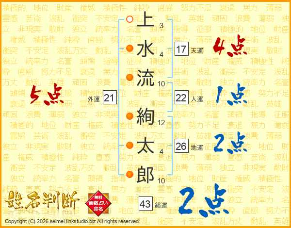上(3画)水(4画)流(10画) 絢(12画)太(4画)郎(10画)