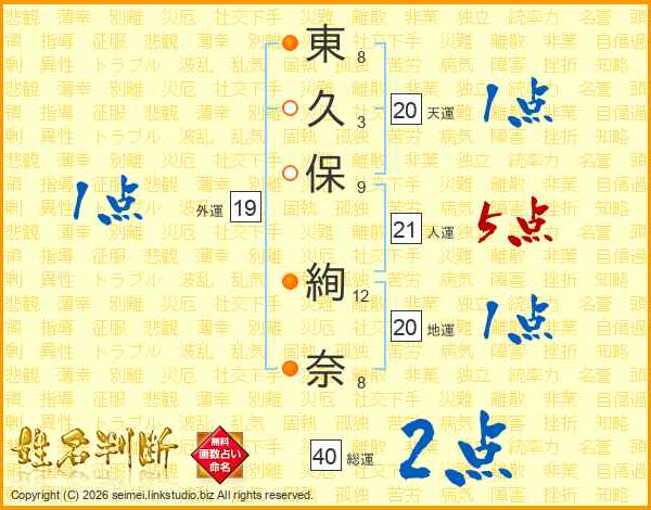 東(8画)久(3画)保(9画) 絢(12画)奈(8画)