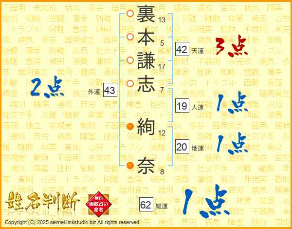 裏(13画)本(5画)謙(17画)志(7画) 絢(12画)奈(8画)