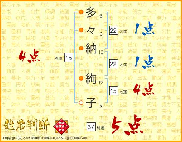 多々納絢子さんの総運は37画の5点!