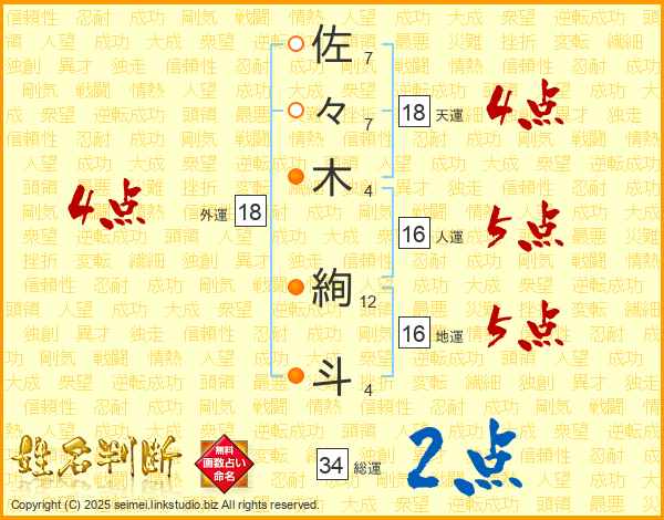 佐々木絢斗さんの総運は34画の2点!