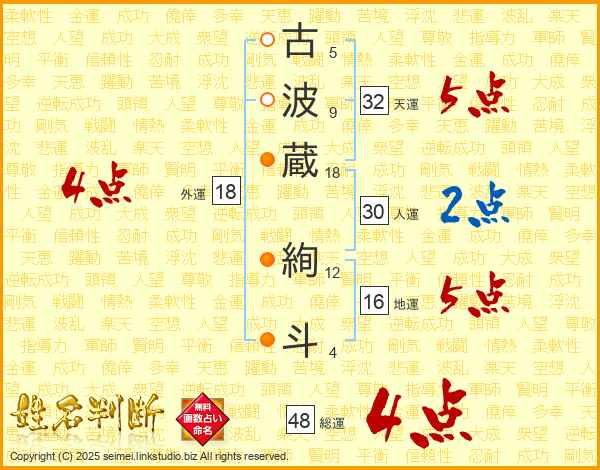 古(5画)波(9画)蔵(18画) 絢(12画)斗(4画)