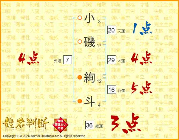 小(3画)磯(17画) 絢(12画)斗(4画)