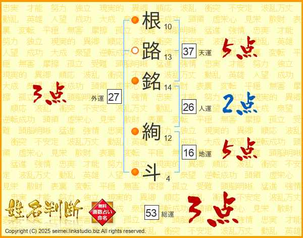 根(10画)路(13画)銘(14画) 絢(12画)斗(4画)