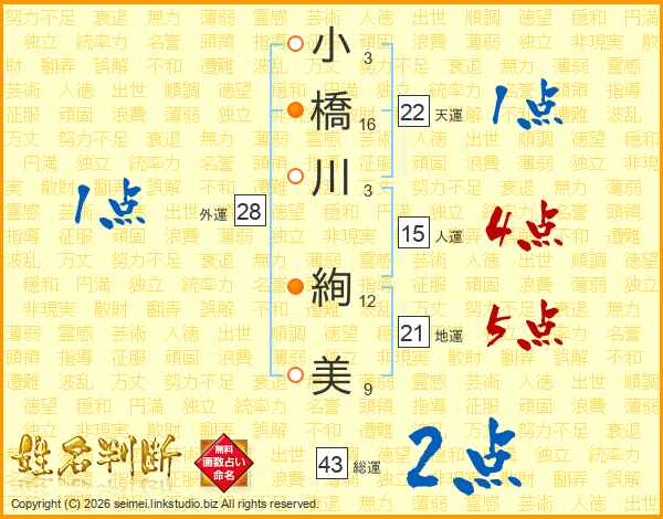 小(3画)橋(16画)川(3画) 絢(12画)美(9画)
