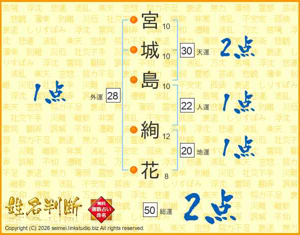宮(10画)城(10画)島(10画) 絢(12画)花(8画)
