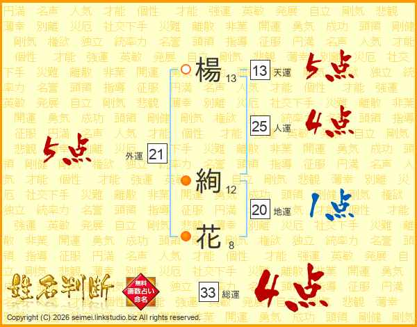 生活面を象徴する運勢です。外部から受ける影響力を表し、結婚運、家庭運や職場、環境への順応性を表します。総運から人運を引いた画数。姓や名が1文字の場合を除く。