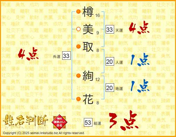 樽(16画)美(9画)取(8画) 絢(12画)花(8画)