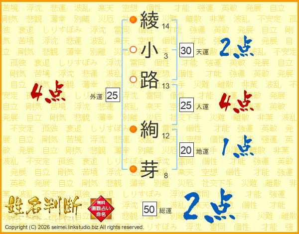 綾(14画)小(3画)路(13画) 絢(12画)芽(8画)