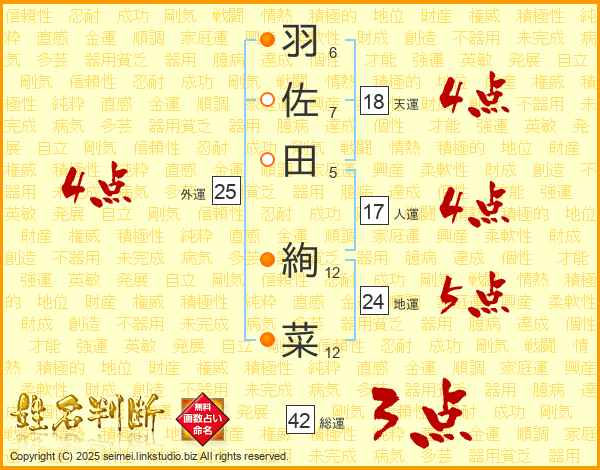 羽(6画)佐(7画)田(5画) 絢(12画)菜(12画)