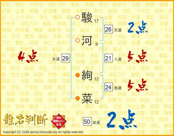 駿(17画)河(9画) 絢(12画)菜(12画)