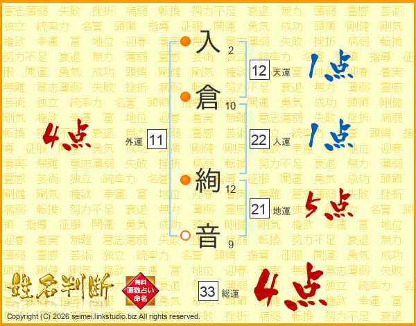 入倉絢音さんの総運は33画の4点!