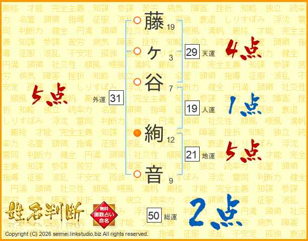 藤(19画)ヶ(3画)谷(7画) 絢(12画)音(9画)