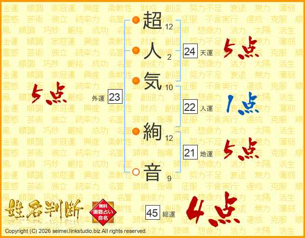 超(12画)人(2画)気(10画) 絢(12画)音(9画)