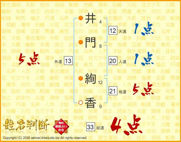 井(4画)門(8画) 絢(12画)香(9画)