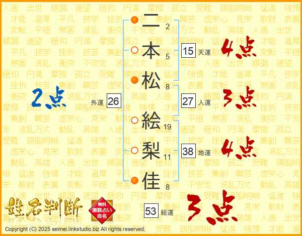 二(2画)本(5画)松(8画) 絵(19画)梨(11画)佳(8画)